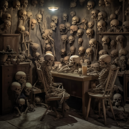 Midjourney Halloween Samhain skeletons sitting at a table - sculls and bones on wall